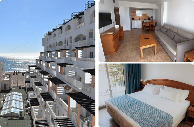 Primero decir desde la puerta del hotel a la arena de la playa habrá unos 20 pasos pues tiene una salida del hotel directo teniendo en cuenta el precio la comida del alojamiento he puesto un 10 recordad que es apartahotel y justo en la puerta principal enfrente tiene un supermercado grande que tiene de todo por si vas con pensión completa o con media pensión o desayuno solo destacar también la cama que son muy cómodas nosotros fuimos la segunda quincena de septiembre y la tranquilidad que había tanto en el hotel como en el entorno no sea lo mismo que en pleno mes de julio agosto destacar también que es un hotel con muchos años pero el mantenimiento se va haciendo que se nota que se hace un buen mantenimiento la piscina está muy bien y tiene otra más pequeña cubierta por si hacer frío o el agua sencillamente está un poco más caliente a nosotros nos gustó bastante por eso le he puesto un día por calidad precio destacar que es muy original el interior y el exterior